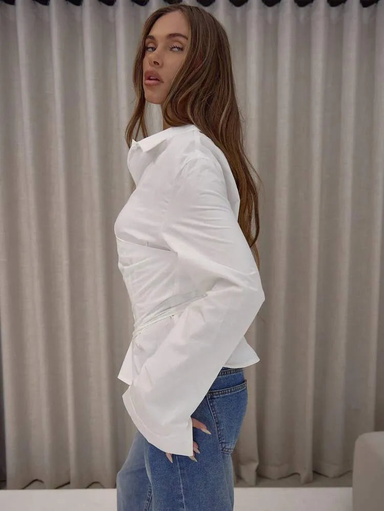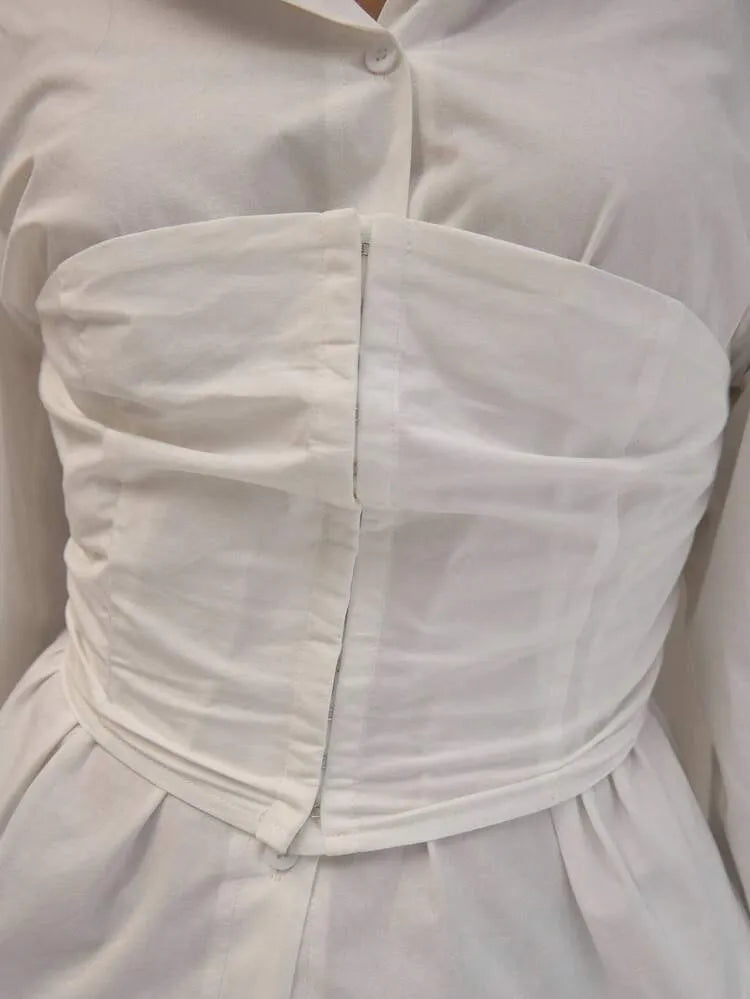 This white button-up shirt offers a modern twist on classic tailoring with a flattering corset-inspired design. Crafted from crisp, lightweight fabric, it features a structured waist panel that defines the silhouette while maintaining the timeless appeal of a classic collared shirt.