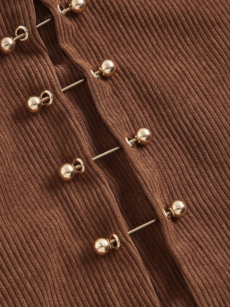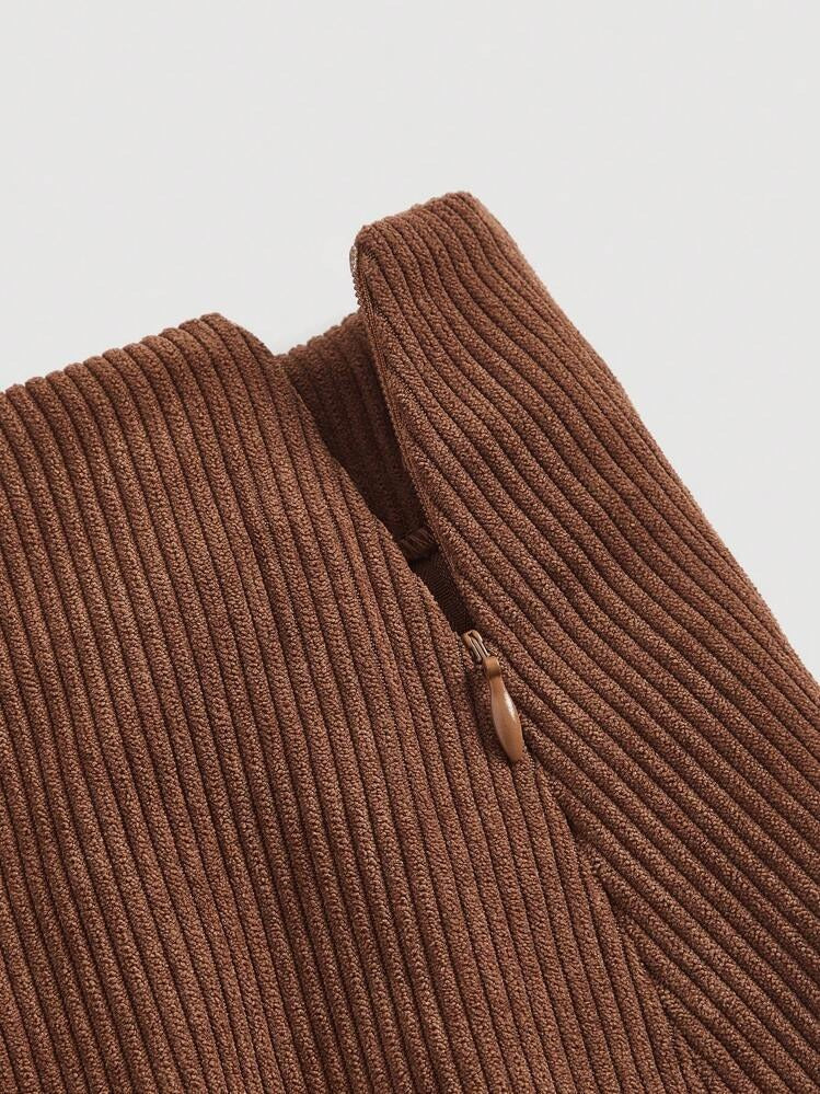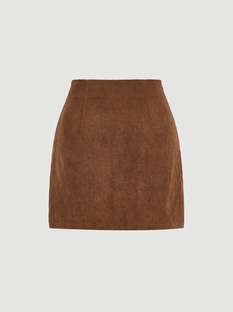 Moonica metal decor asymmetrical hem skirt, spring/fall casual wear for women. Grommet eyelet zipper mini design in natural brown, plain and comfortable fit.