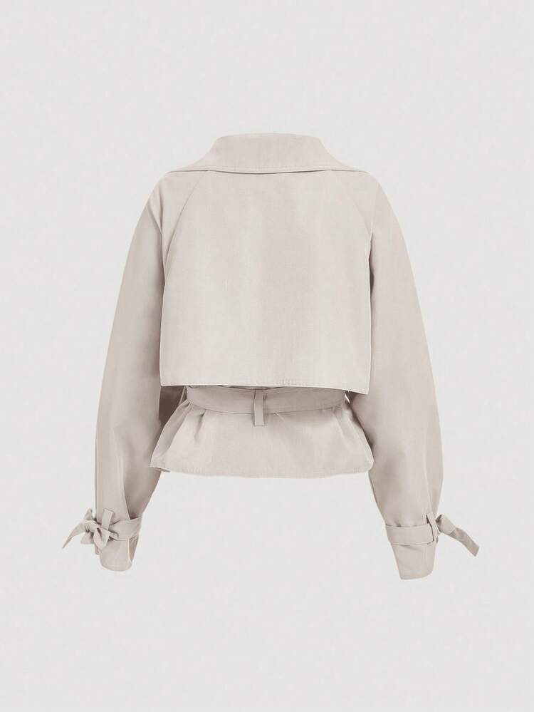 Moonica vintage apricot short trench coat with asymmetrical design and belt. 70s-inspired preppy look, casual and comfortable. Perfect for daily wear, commuting, or office outfits. Cozy and stylish choice for fall and winter seasons.