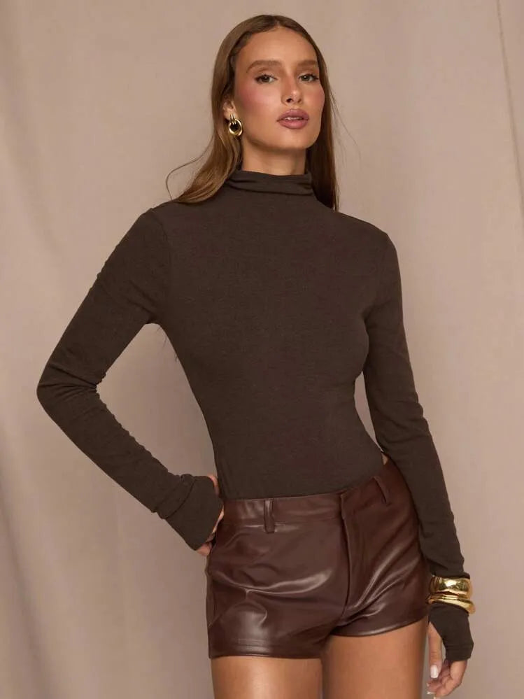 Moonica Mocha Long Sleeve Bodysuit – A soft knitted bodysuit in warm mocha brown, designed for a sleek and feminine fit. Crafted from comfortable cashmere-blend fabric with a stand collar and slim silhouette. Perfect for layering in fall and winter — pair it with leather shorts, jeans, or blazers for a chic everyday look.