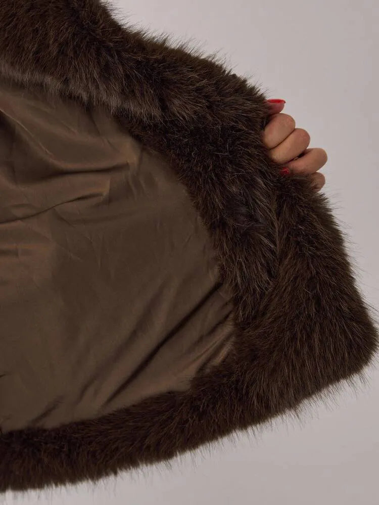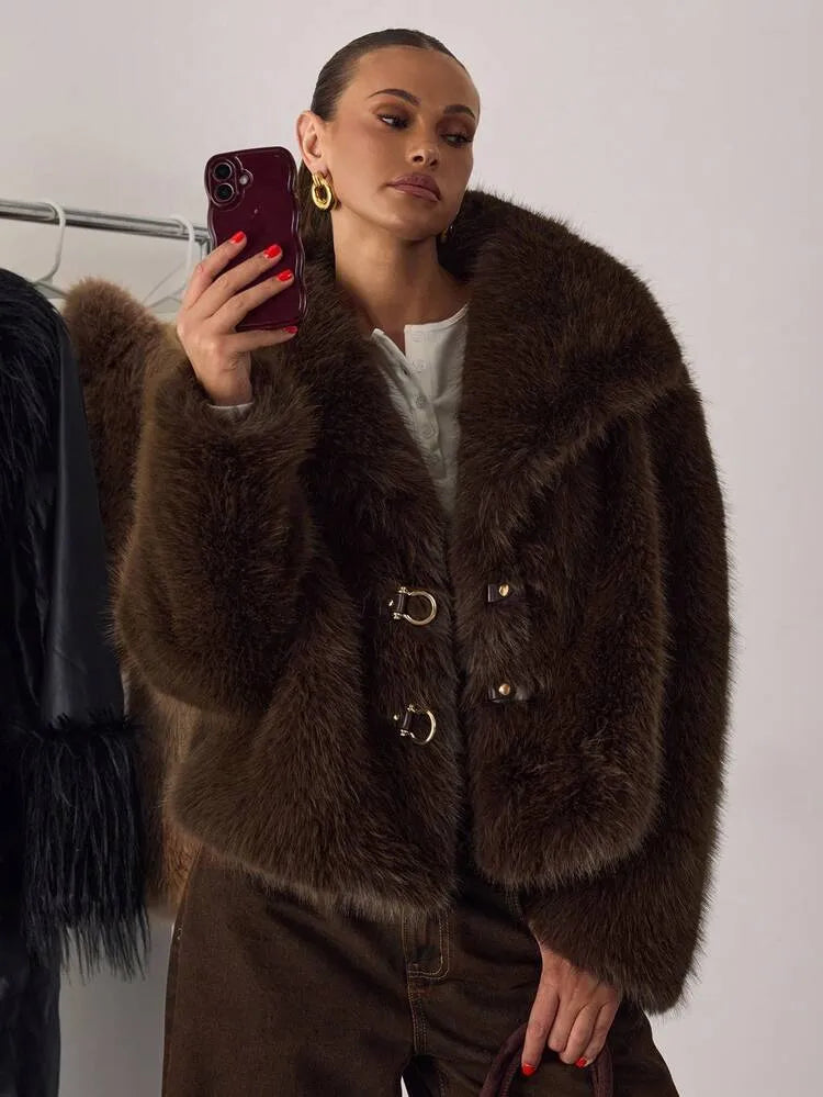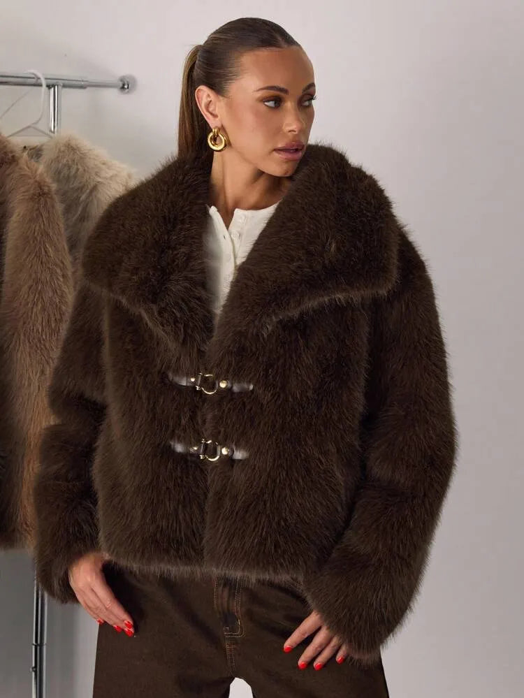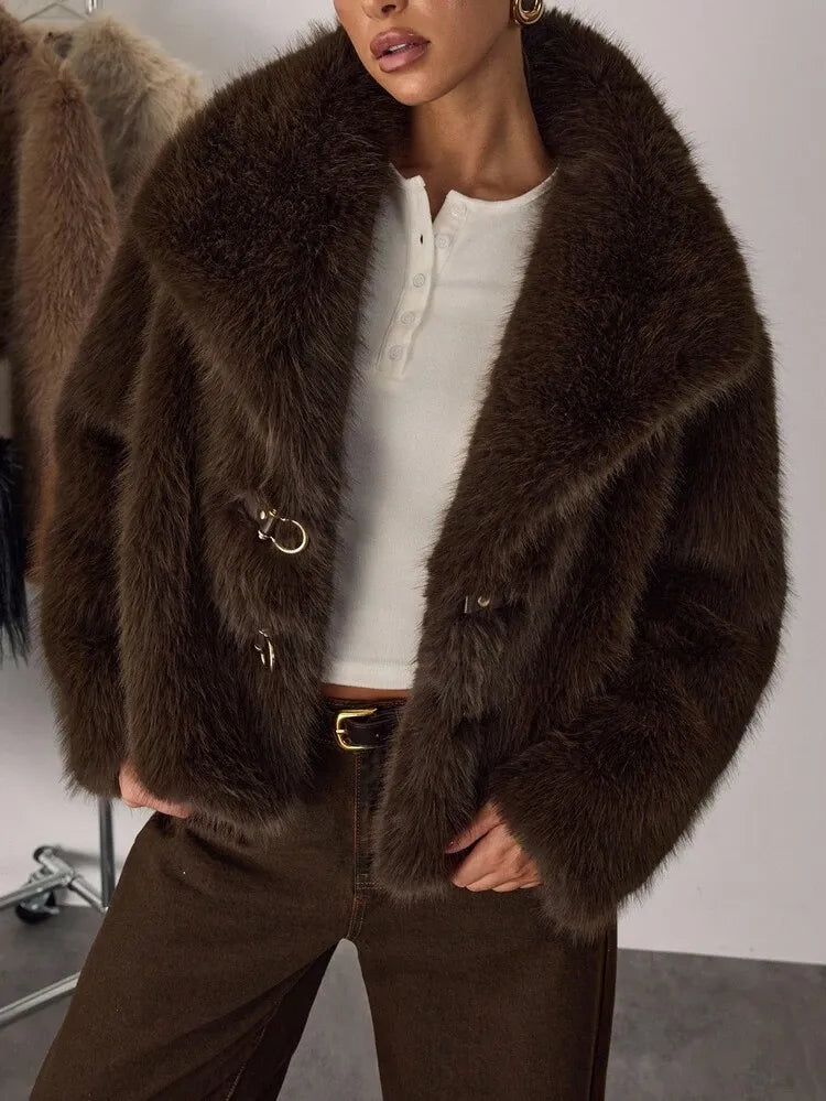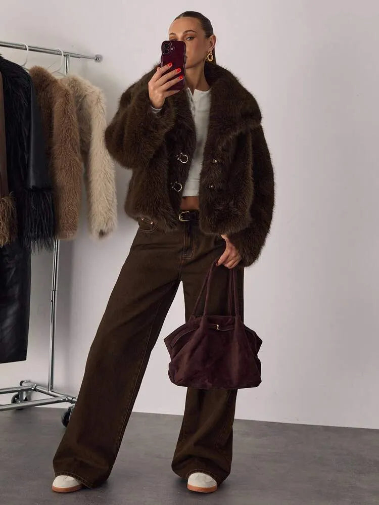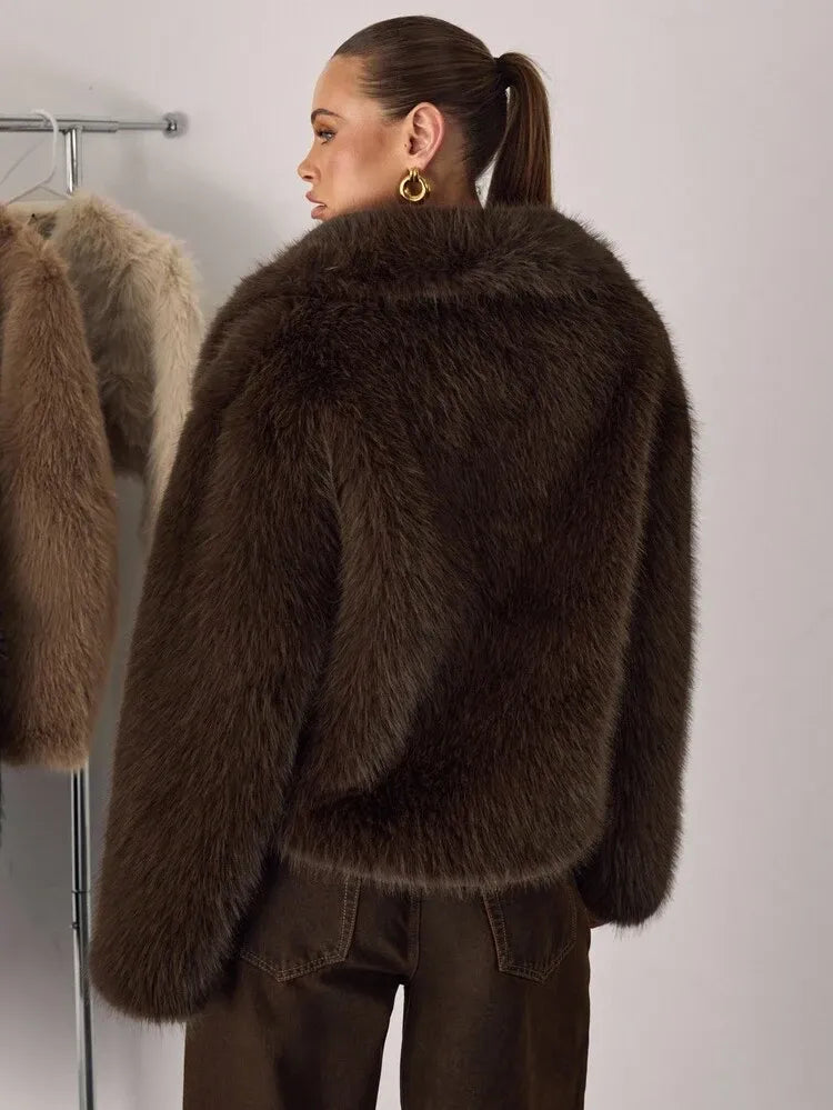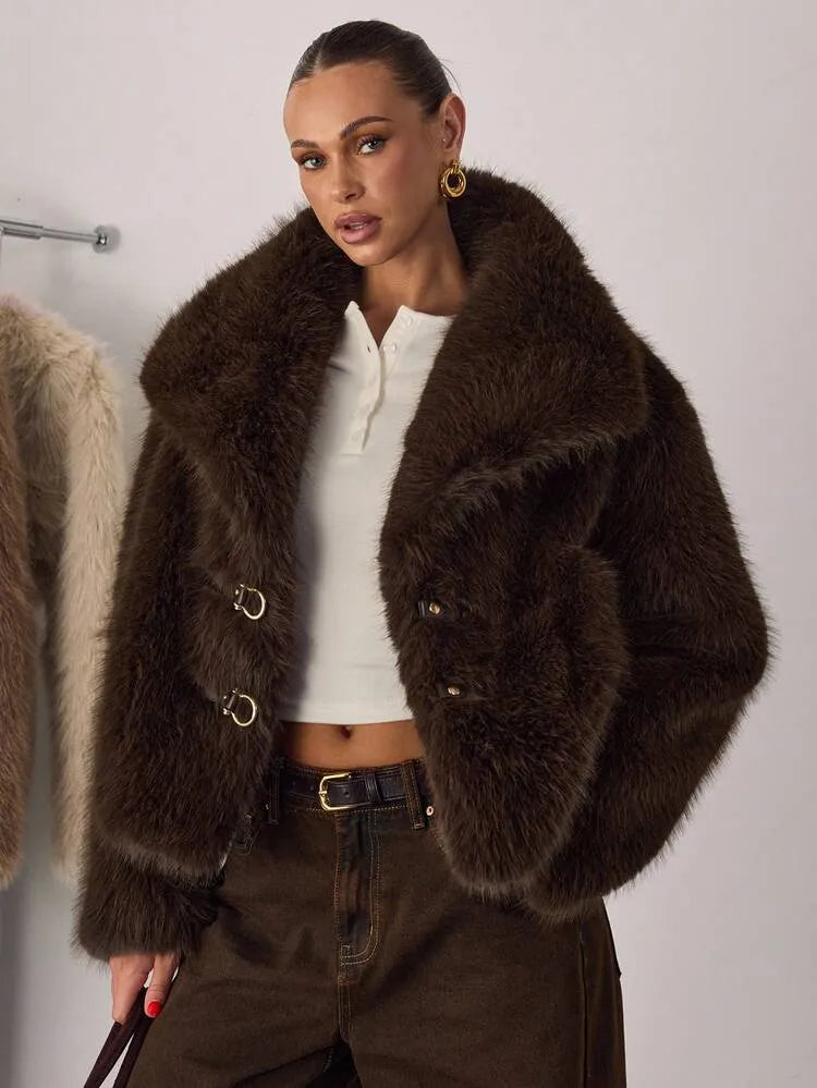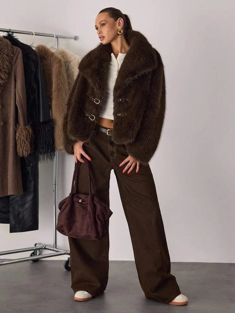 Moonica Brown Faux Fur Coat – A luxurious cropped faux fur coat in rich chocolate brown, featuring a lapel collar and metal hook closures. Soft, warm, and effortlessly elegant — perfect for fall and winter layering. Style it with wide-leg pants or dresses for a cozy yet high-fashion look.
