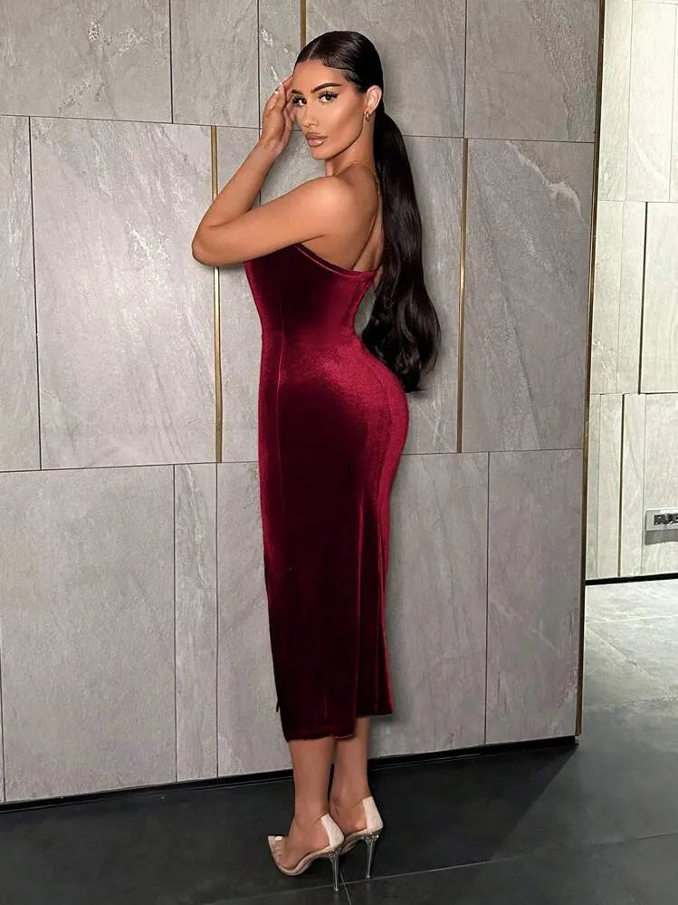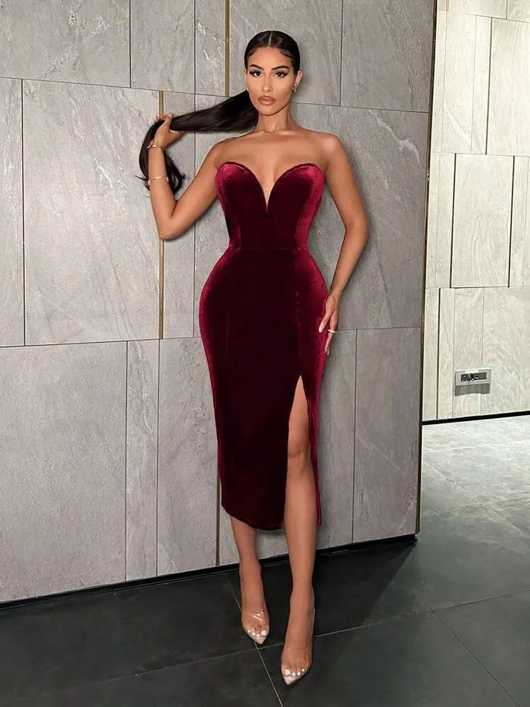 Moonica Velvet Strapless High-Slit Dress – A luxurious deep red velvet bandeau dress featuring a sweetheart neckline and thigh-high slit for a bold, elegant look. Crafted with a body-hugging fit that enhances your natural curves — perfect for evening events, parties, or date nights. Glamorous, feminine, and timeless.