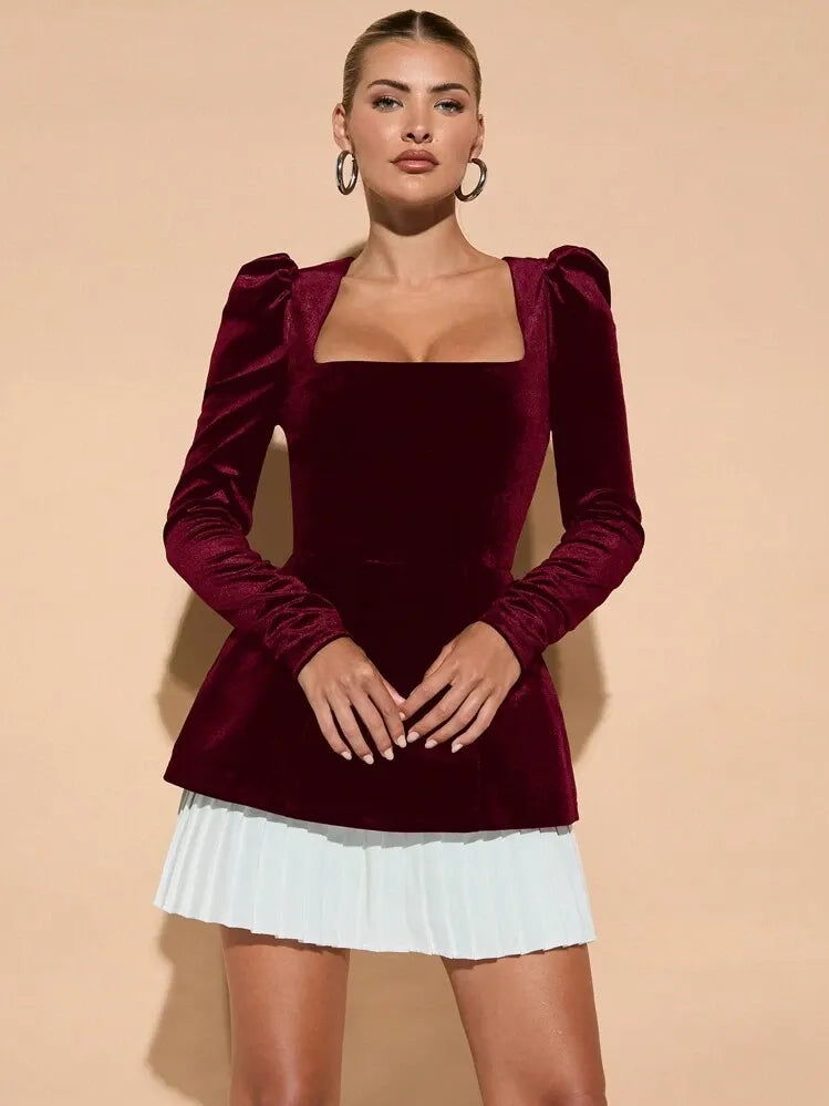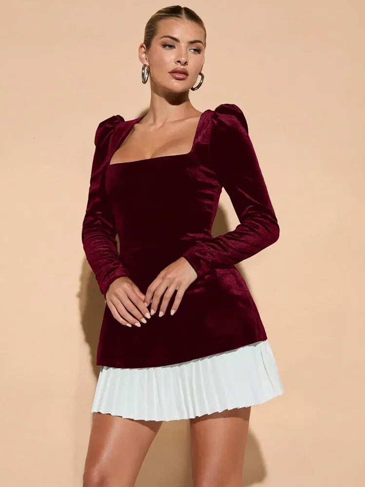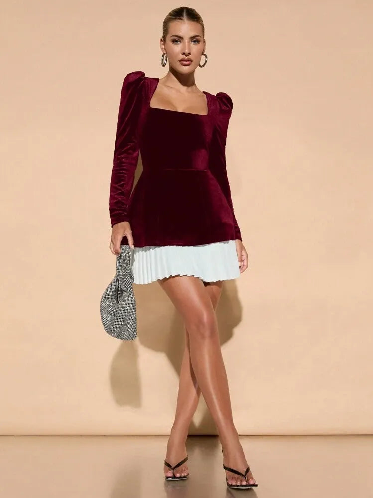 Moonica Velvet Puff Sleeve Mini Dress – A luxurious burgundy velvet dress with puff shoulders, long sleeves, and white pleated hem. The elegant colorblock design brings a romantic yet sophisticated charm. Perfect for fall and winter parties, date nights, and special occasions — graceful, feminine, and timeless.