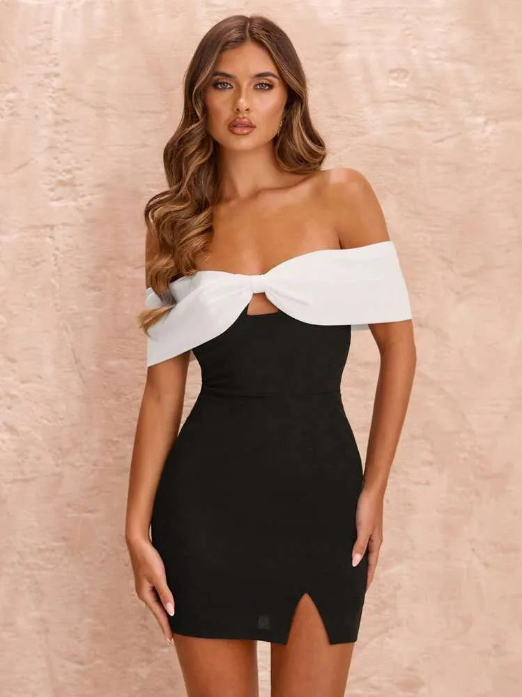 Moonica Black & White Off-Shoulder Mini Dress – A stunning two-tone bodycon mini dress featuring an off-shoulder bow neckline and side slit. Designed for a flattering slim fit that accentuates your curves with timeless elegance. Perfect for spring and summer nights, parties, or romantic dinners.