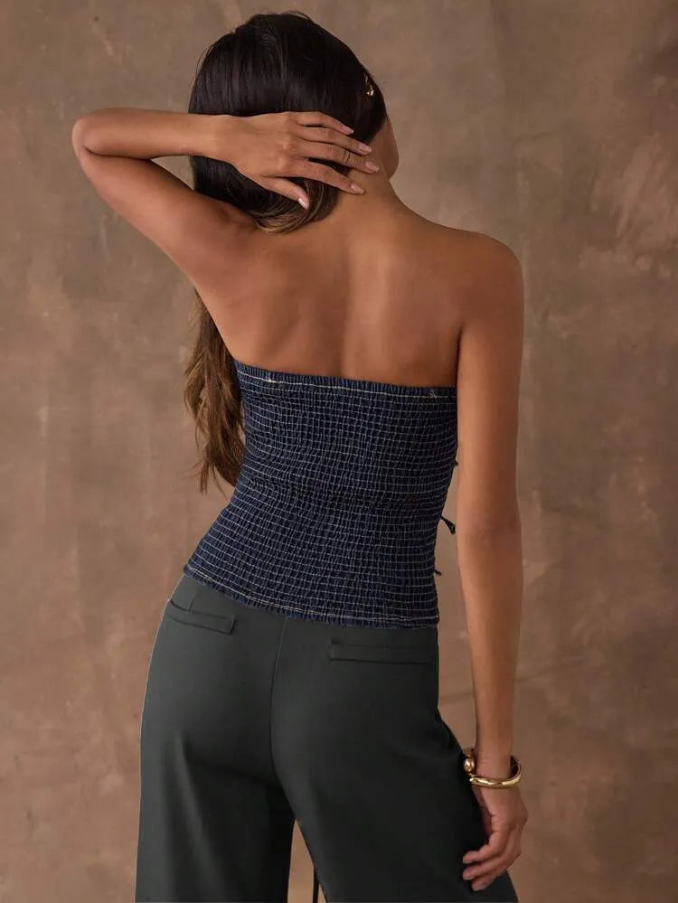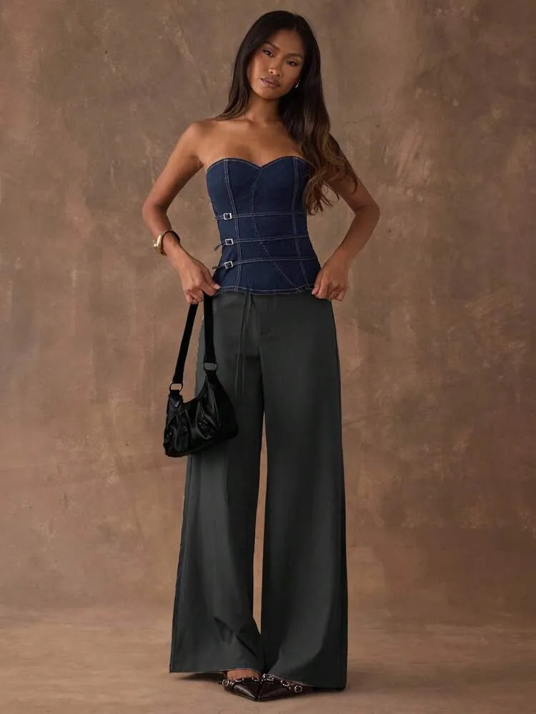 Moonica Denim Buckle Corset Top – A structured denim tube top featuring bold metal buckle details and contrast stitching. Designed for a flattering silhouette with a snug, supportive fit. Perfect for night-outs, street style, or layering under blazers for an edgy yet feminine look.