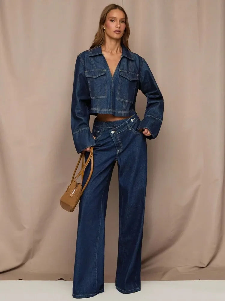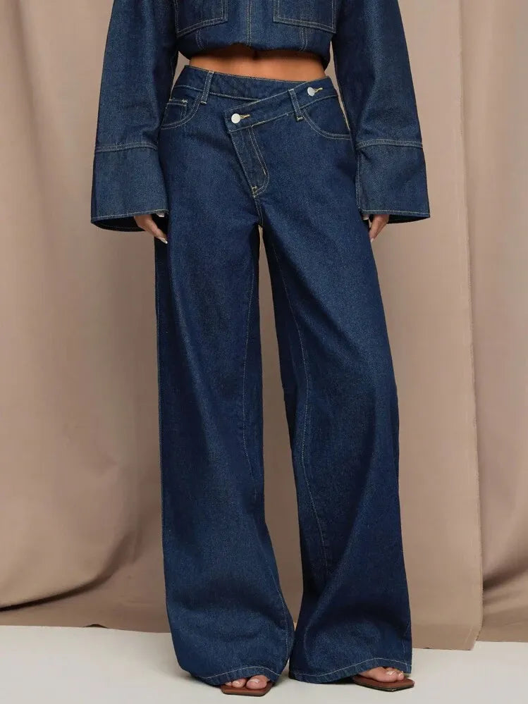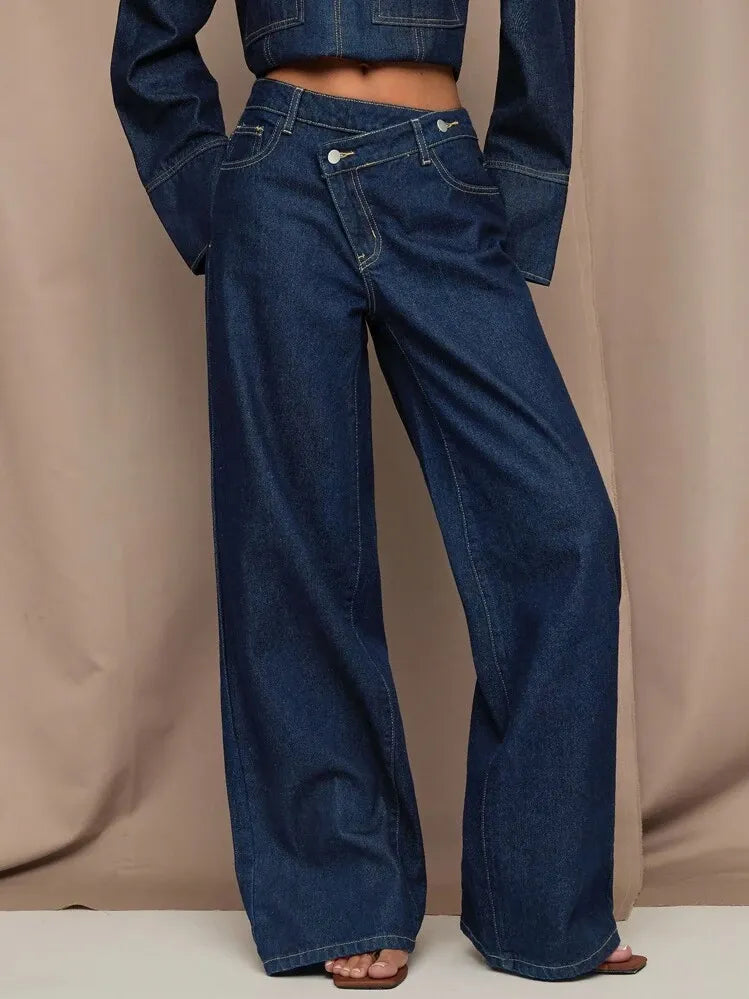 Moonica Asymmetric Waist Wide-Leg Jeans – Trendy dark blue denim jeans featuring an asymmetric waist design and relaxed wide-leg fit. Crafted from premium washed denim for a chic yet comfortable look. Perfect for casual days, office wear, or weekend outings — a must-have for modern minimal wardrobes.